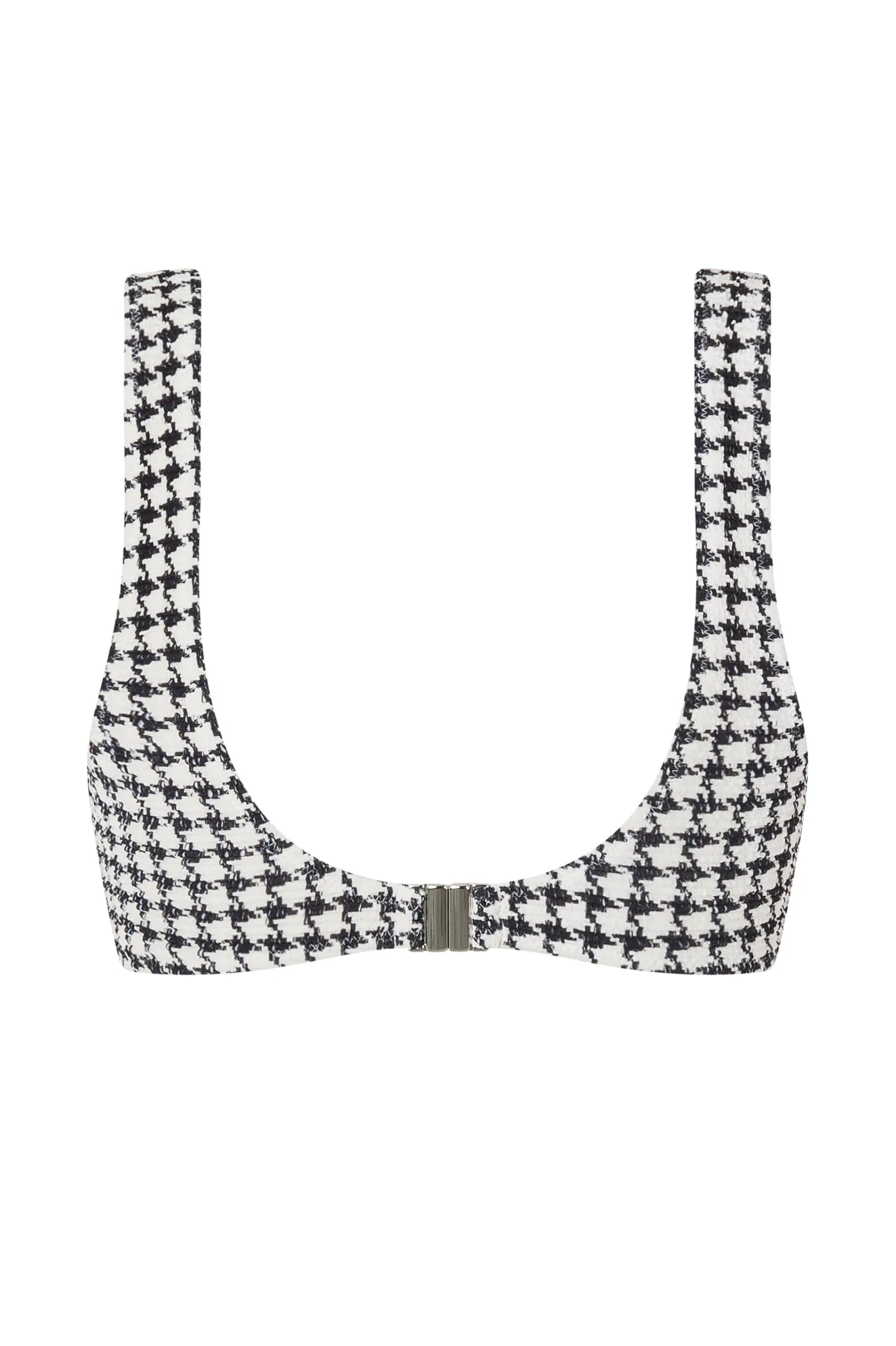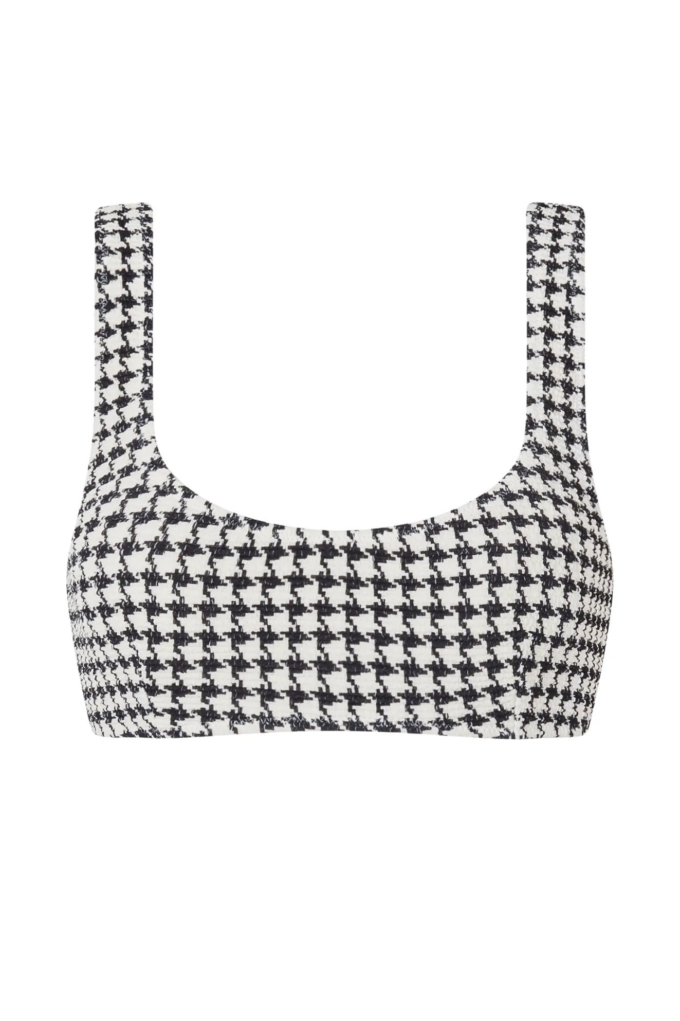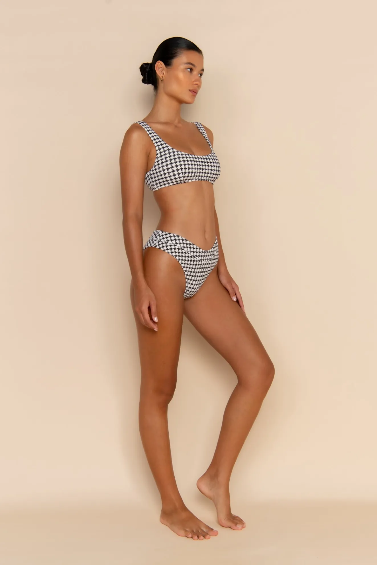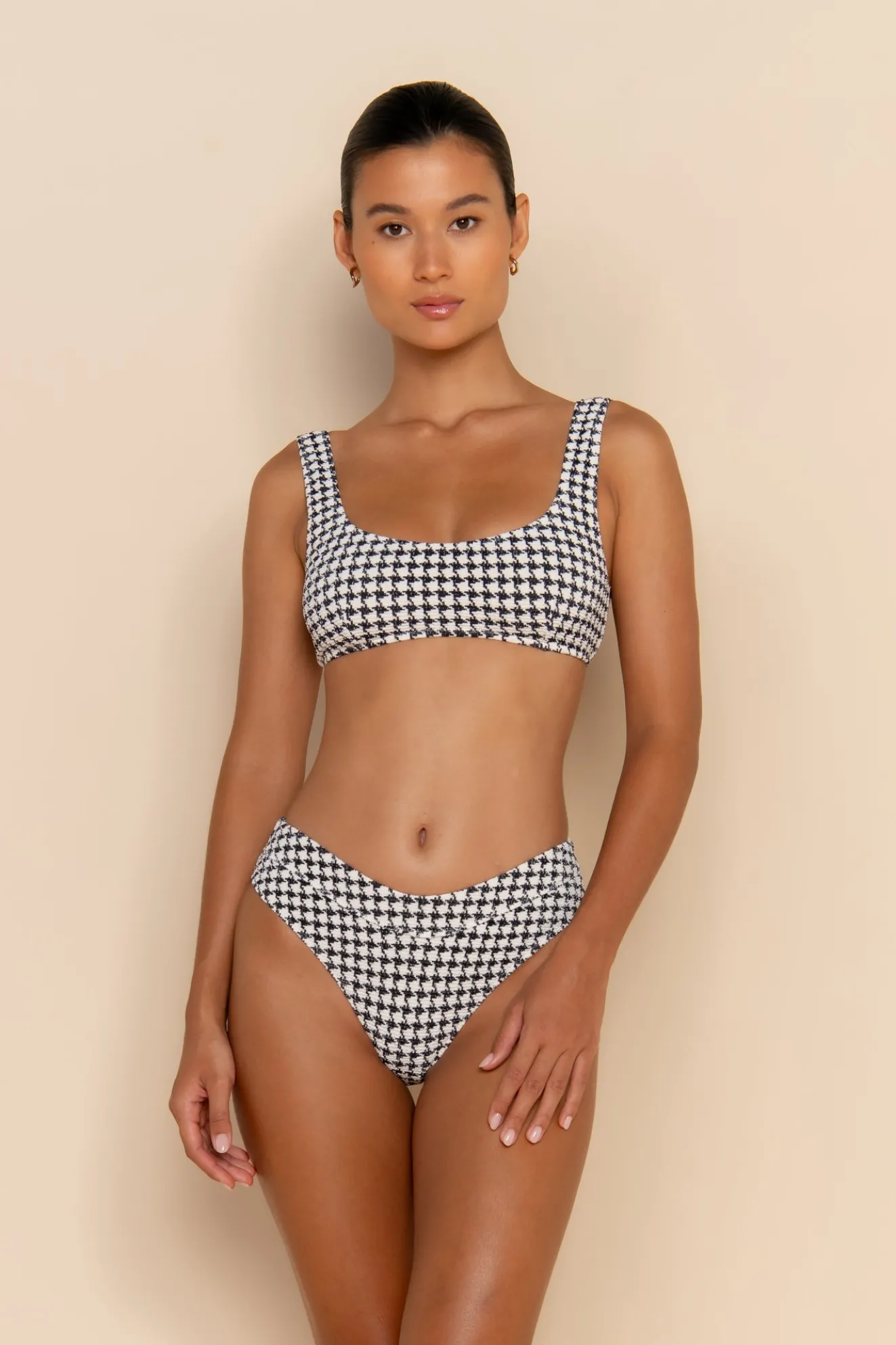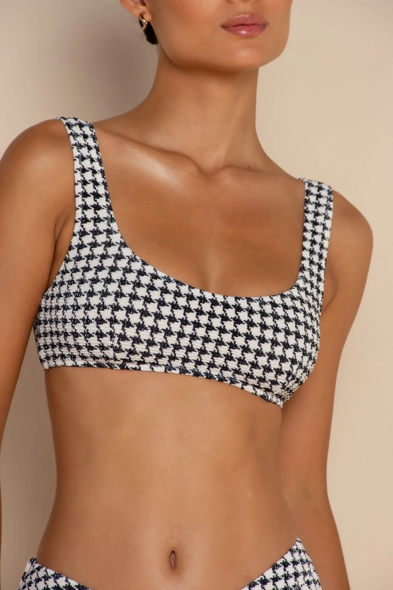 The Escape Bralette Top in Houndstooth offers medium support with a minimal, underwire-free design. Made from our Signature Elce Textured fabric in an exclusive print, it features fixed straps and removable padding for customizable comfort. Double lined for a smooth fit, this bralette is perfect for effortless style, designed to be paired with the Escape Cheeky and mid rise bottoms. If you’re between sizes, we recommend sizing down for the best fit.